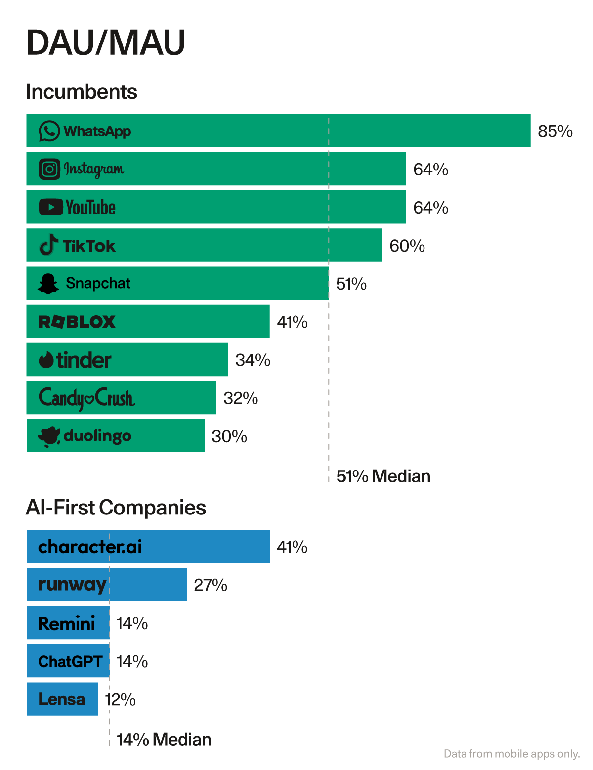 In fact, the painted picture is even worse if we look at these products' DAU/MAU ratio. For instance, only 12% of monthly active users use ChatGPT daily: