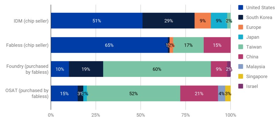 Chip fabrication is outsourced to TSMC (Taiwan), Samsung (South Korea), and, to a lesser extent, Intel (US). This means that US companies are mainly fabless (they design, not produce), while companies in Taiwan or Samsung are ‘fabs’, aka manufacturers (there are exceptions like Samsung, which does both).