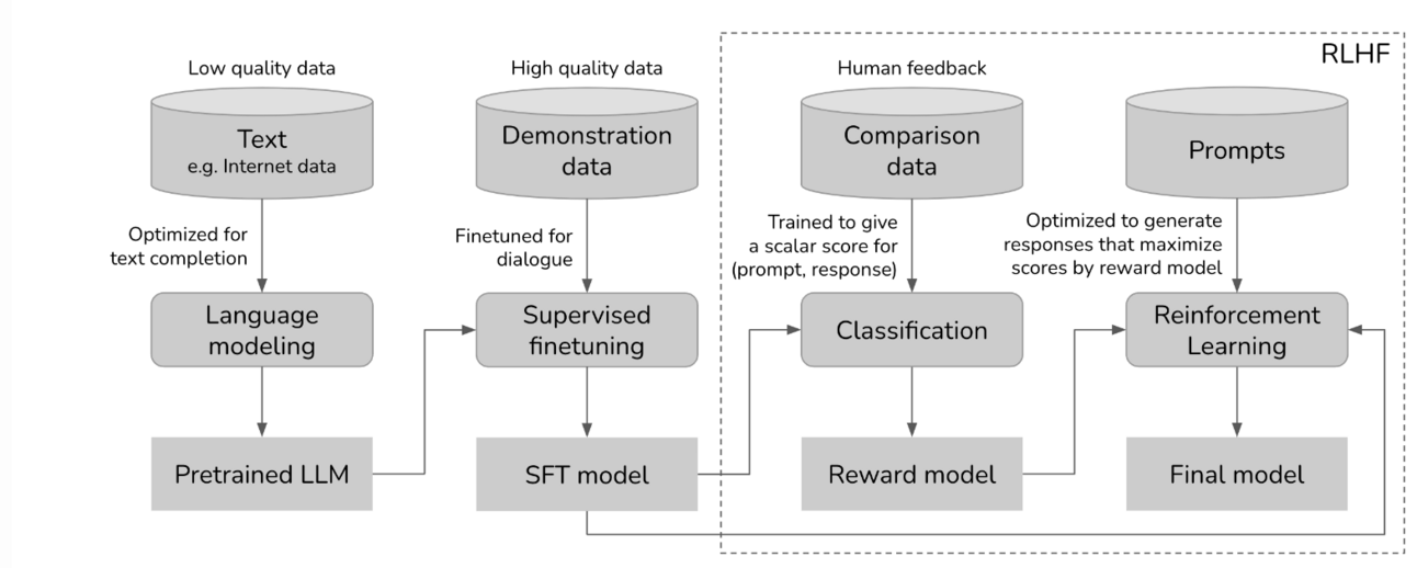 Reinforcement Learning from Human Feedback, or RLHF, steps 3 and 4, does exactly that by teaching the model to not only answer as expected but to give the best and safest possible answer aligned with human preferences.