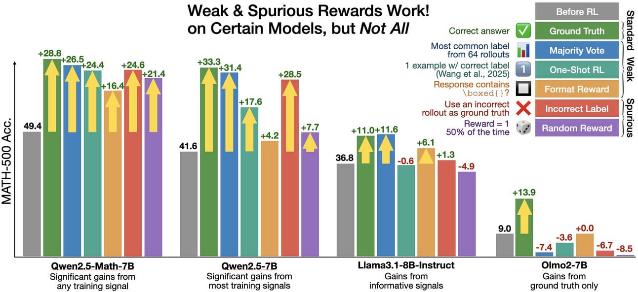 To prove this, researchers trained models on incorrect rewards but realized that only some of them benefited. Alibaba's Qwen models did improve performance, but Llama (Meta) and Olmo (AI2) didn't.