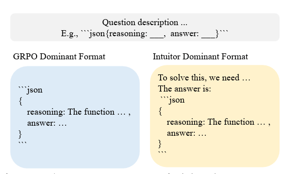 Interestingly, Intuitor demonstrates emerging reasoning, where the model learns to reason in response to the user’s request (right), incorporating a pre-reasoning effort before providing the actual, structured response.
