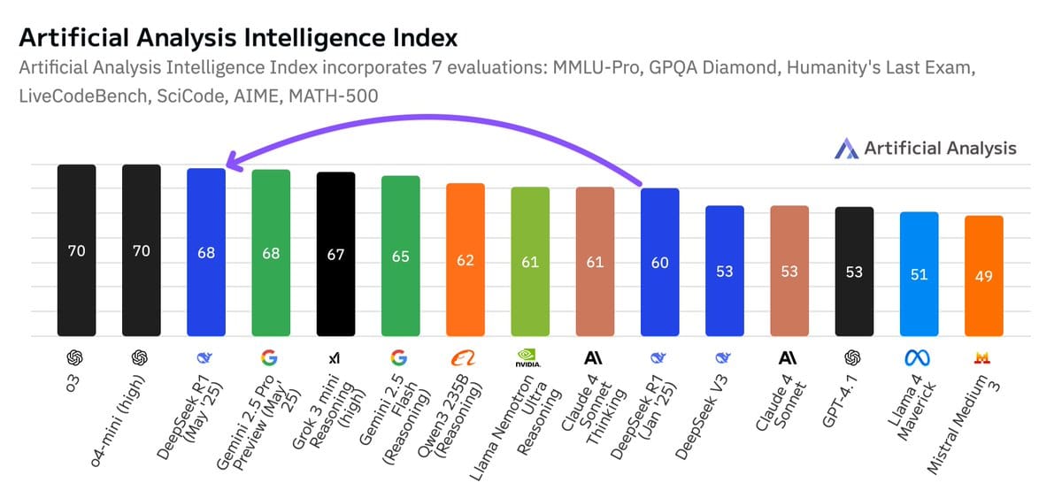 According to Artificial Analysis, an independent and well-respected AI model evaluation company, DeepSeek’s new model, R1-0528, which we covered on Tuesday, is now the second-best model overall in their intelligence index, only behind OpenAI’s o3 and surpassing Google’s Gemini models.