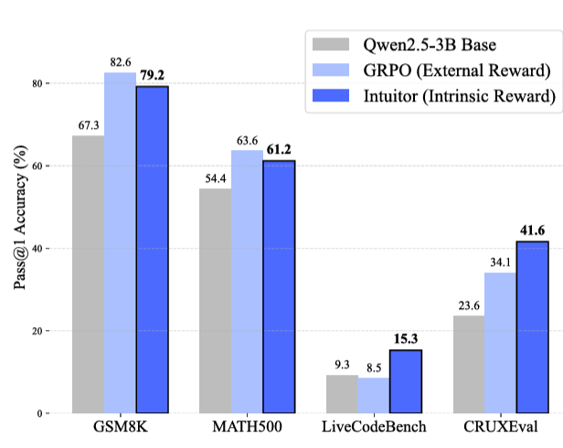 As shown in the graph below, Intuitor is competitive with GRPO (the training method used for models such as DeepSeek R1 or OpenAI’s o3) in mathematics while being superior in areas like coding.