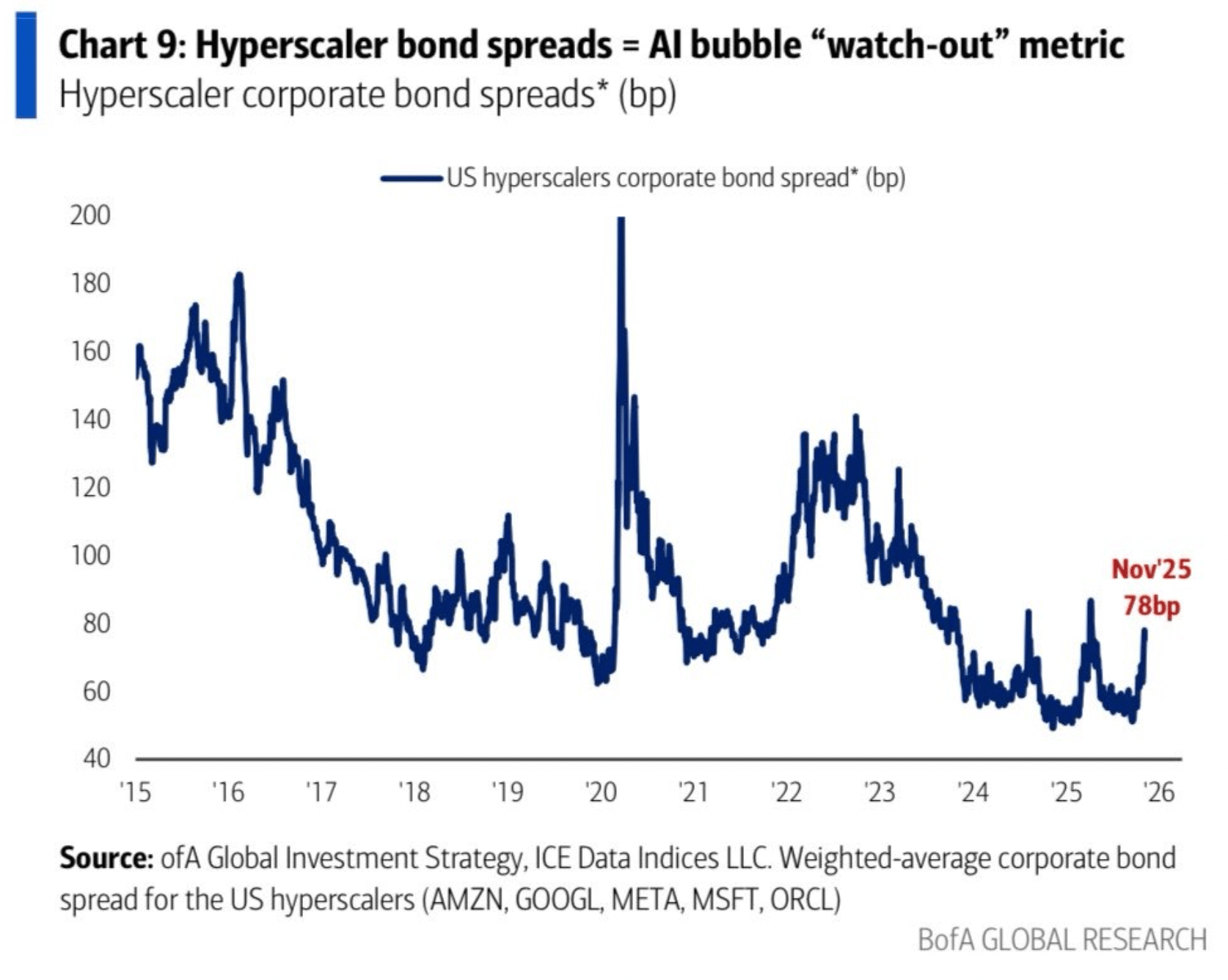 That said, even though it’s early to panic, corporate bond spreads for Hyperscalers are spiking back again to 78 basis points this November, to the point some analysts are citing this metric as something to “watch out” for.