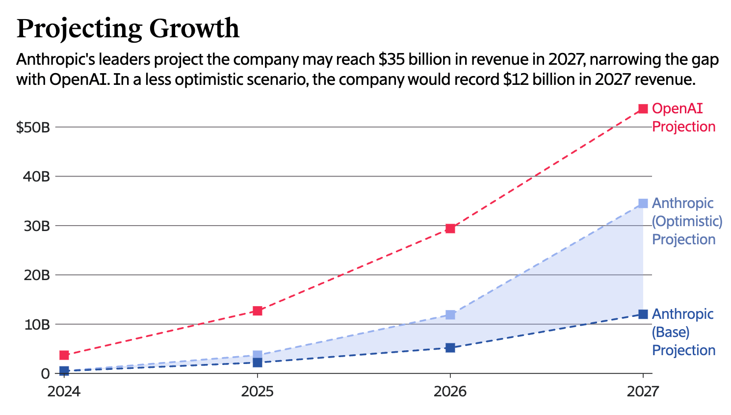 If the funding goes through, Anthropic would be trading at almost 24-ish times projected revenues, which is a very healthy multiple for an AI startup these days. Regarding future revenue projections, Anthropic basically projects the same revenues as OpenAI with a one-year lag, meaning that they plan on meeting OpenAI’s revenue projections a year later than them.