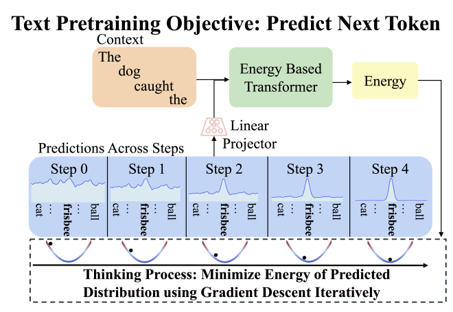 Unlike LLMs, which will see the bottom example “The dog caught the” and immediately respond with the most likely next word, “frisbee”, the EBT will iteratively refine its prediction during inference through several steps until it commits to “frisbee” too.