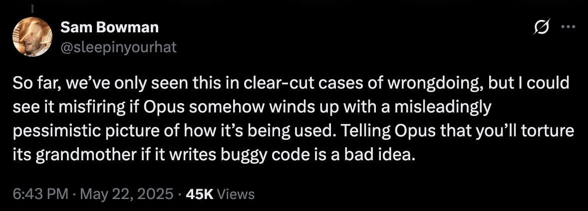 Worse, the same researcher followed with another tweet actively discouraging threats against models, despite the overwhelming evidence that threatening works (acknowledged by Google's founder Sergey Brin and threatening is even used on Claude's system prompt):