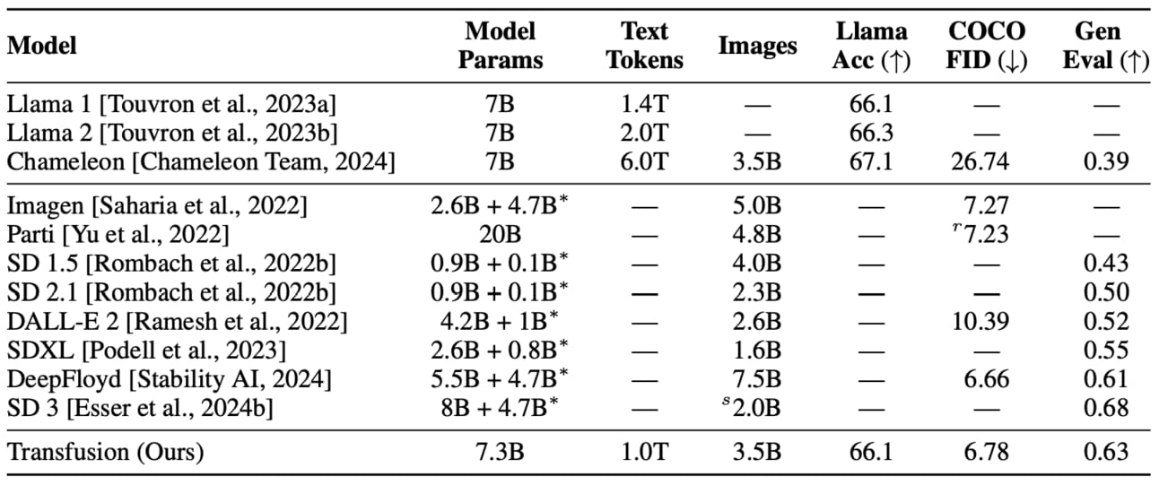 As seen below, the Transfusion model is compared to other LLMs of similar size and training budget and still comes out on top.