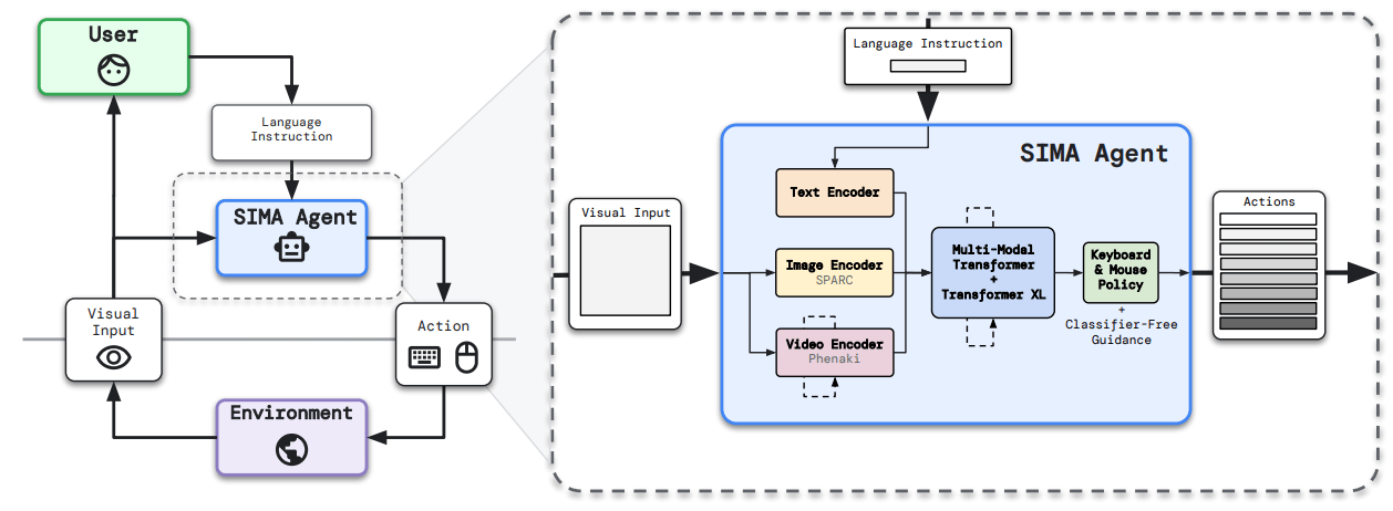 With the provided information, SIMA then uses a set of transformer models (just like ChatGPT would) to take the representations generated by the different encoders, and, instead of predicting the word as an LLM would, this model outputs the policy that dictates the keyboard and mouse actions to be executed by the agent.