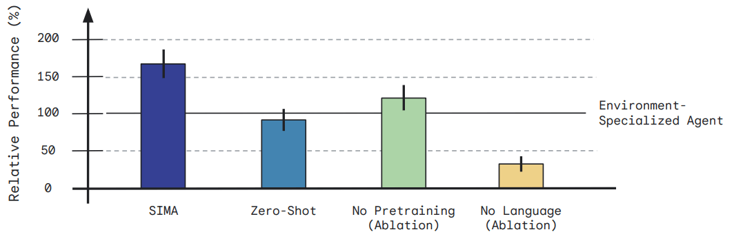 For starters, despite being trained in many different games in parallel, on average SIMA performed better than agents specialized in playing one single game… in that specific game: