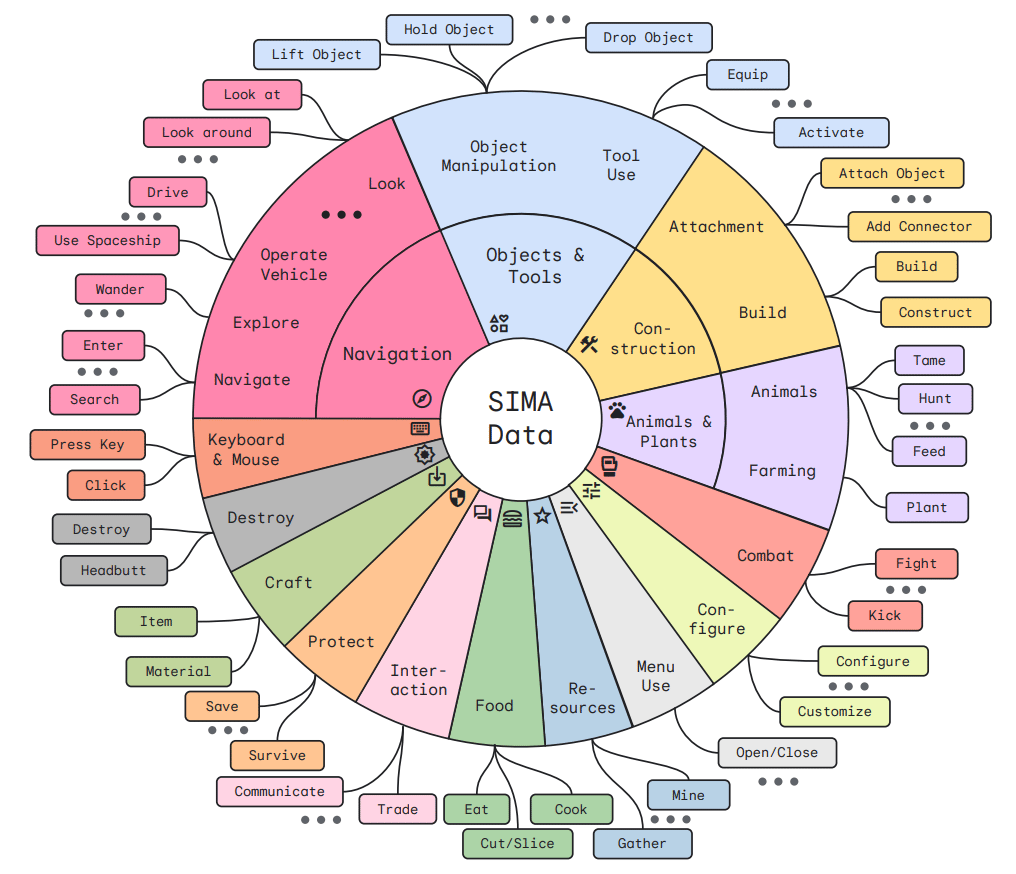 After training, the SIMA agent was capable of performing up to 600 different basic tasks, grouped into different categories such as navigation, animal interaction, food, etc: