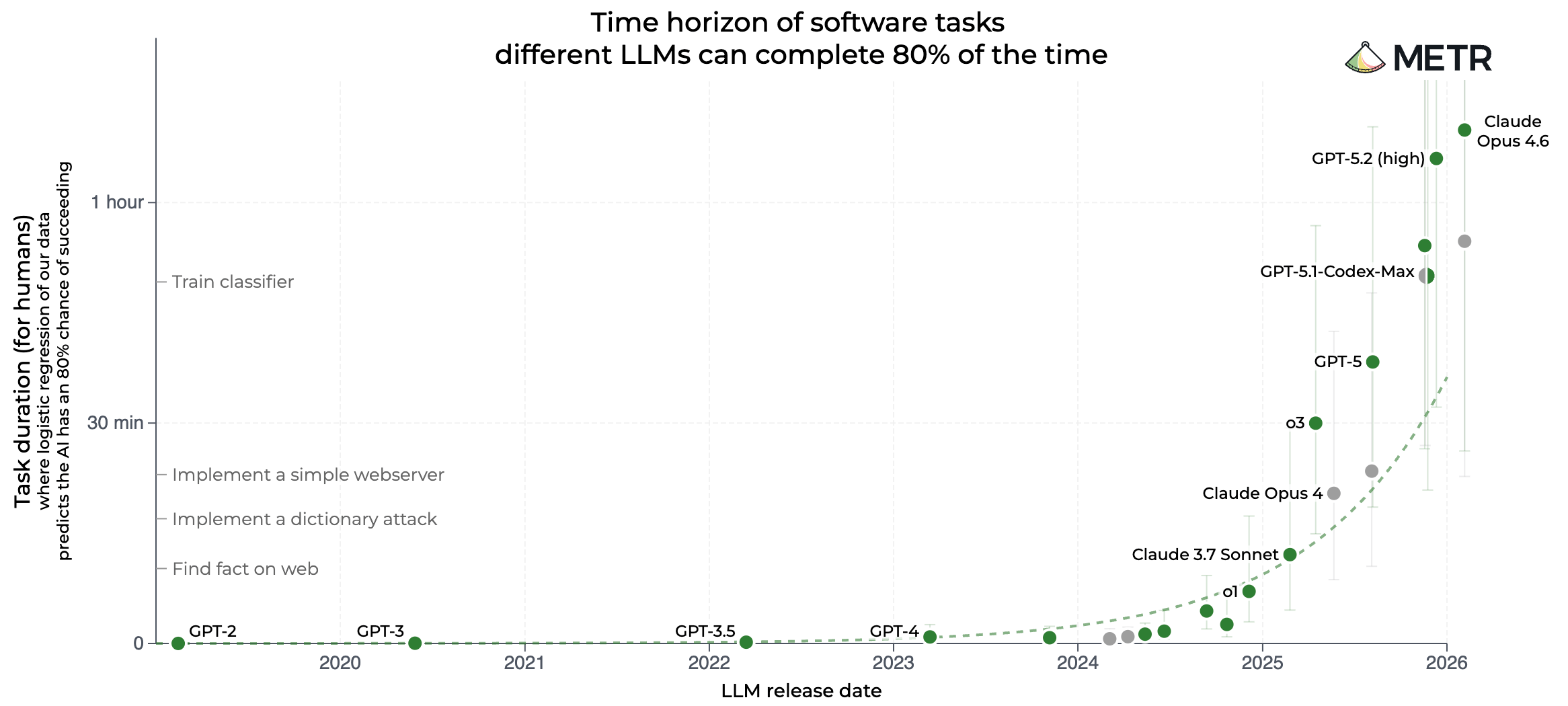 One of the most popular benchmarks in AI right now is METR, which measures long-horizon task accuracy. In plain English, it measures how long the longest task an AI can do by itself is, in human hours, with 50% accuracy.