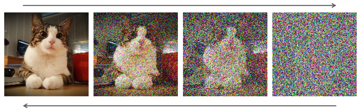 The image above portrays the training process. From a ground truth image (left), noise (random pixel values) is consistently added to the image, returning the image on the far right.