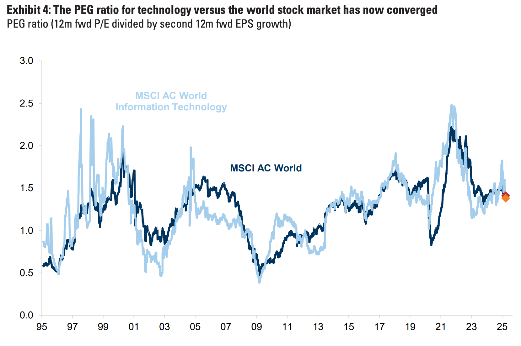 We also have European or Chinese AI stocks to account for. Surprisingly, as recent as March 2025, if we compare global tech stocks to the rest in terms of PEG (PE ratio scaled by future growth), valuations had actually converged.