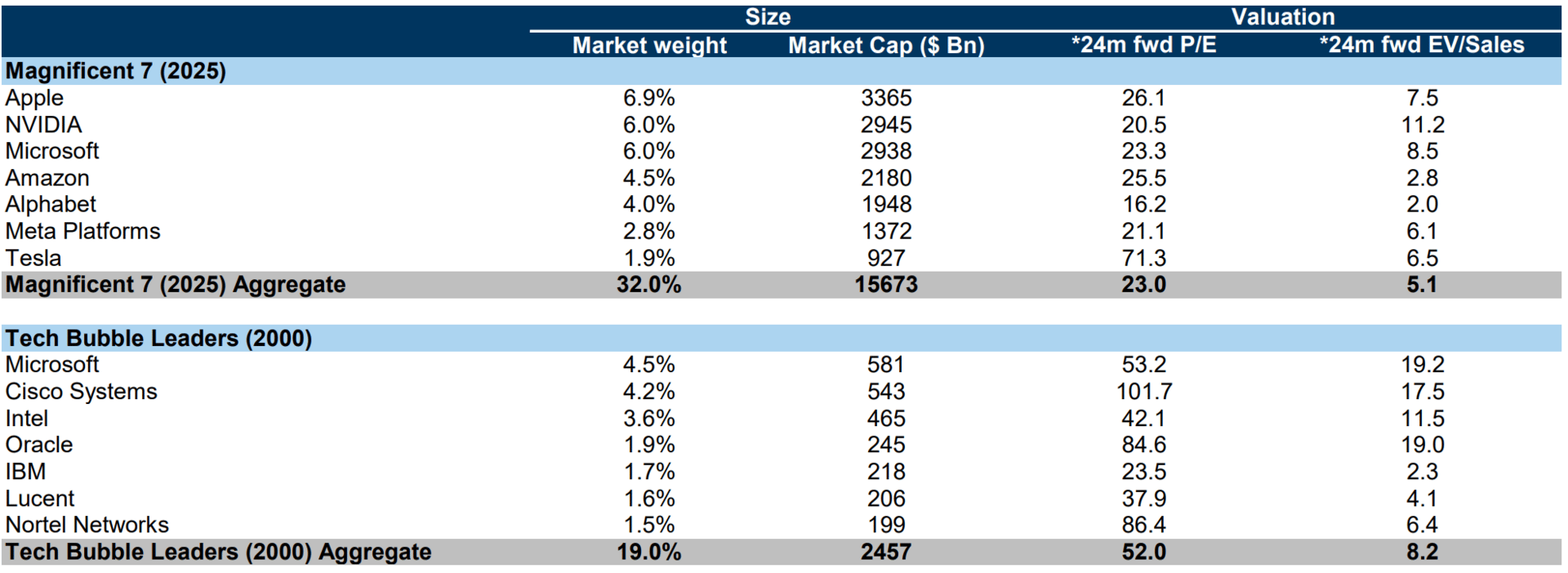 It’s worth pointing out that the numbers above for the Mag 7 are outdated (data from March), and current market weights and caps have changed (Mag 7 are more expensive today), but the points still stands as they aren’t remotely close to dot-com levels.