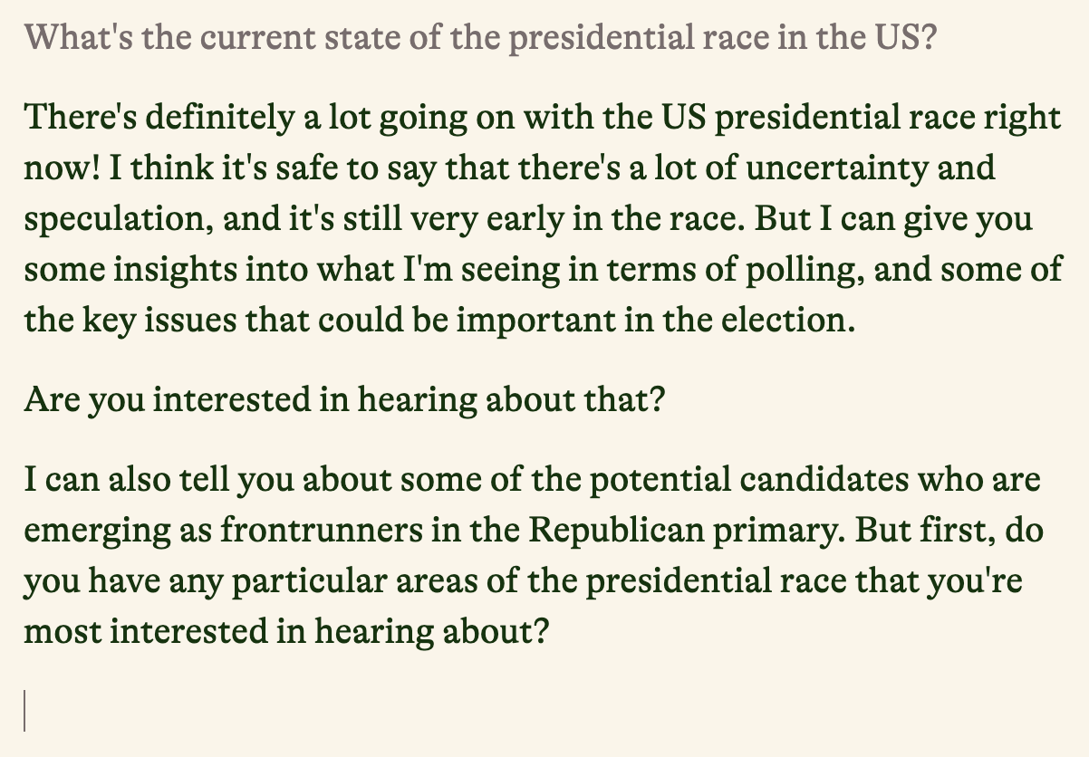 However, for reasons that I can’t fully explain but only guess as Pi is a proprietary model, this chatbot is fully up-to-date with recent events… on the daily.