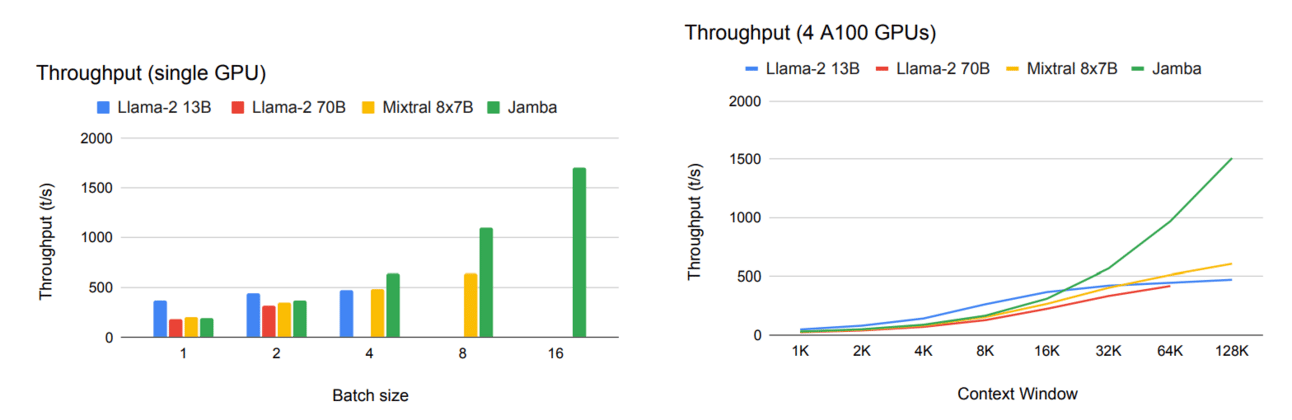 Also, the combined effects of using Mamba and MoE allow Jamba to have insane throughputs (tokens per second prediction), much higher than much smaller models like LLaMa2 13B despite being much larger: