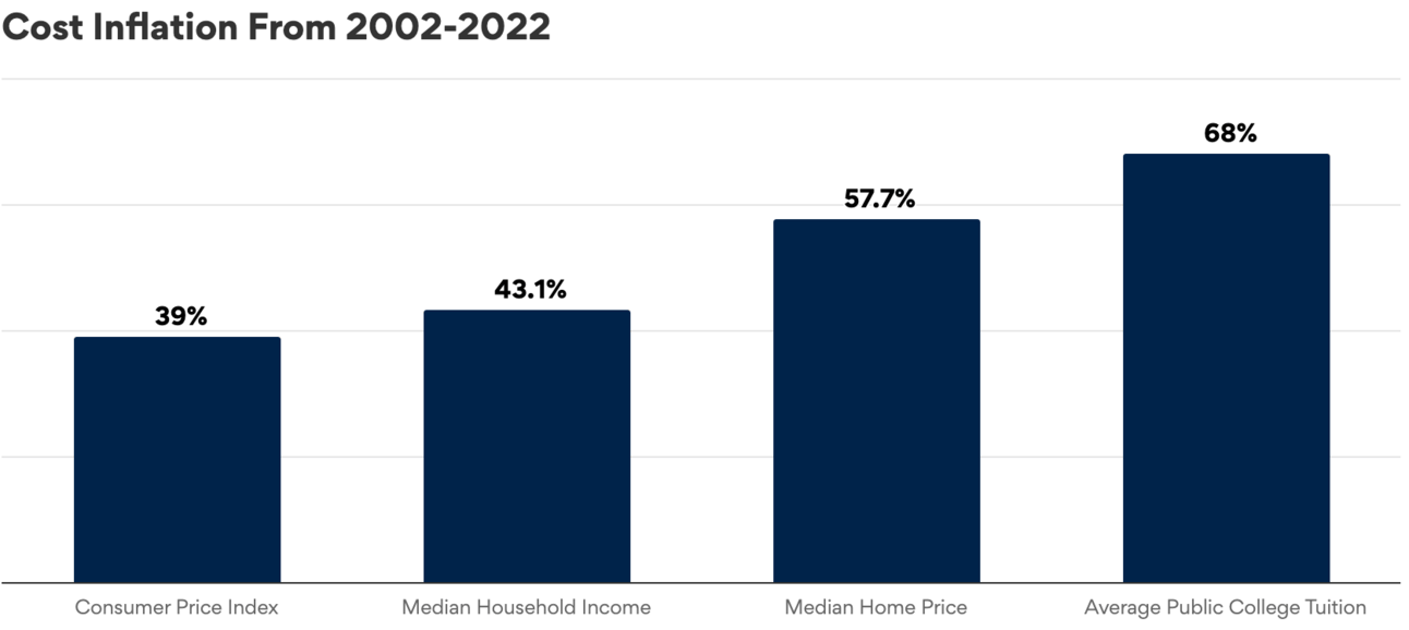 Despite not preparing our future generations as they should, college tuition has grown twice as fast (68%) in the past twenty years than the Consumer Price Index (CPI) (39%). College tuition costs have even outpaced the increase in median Home prices.