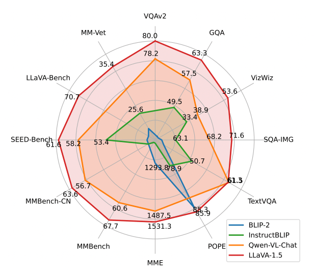 Out of the 12 most popular multimodal benchmarks, LLaVa 1.5 is the new state-of-the-art (SOTA) for 11 out of the 12, beating other popular open-source models by a landslide.