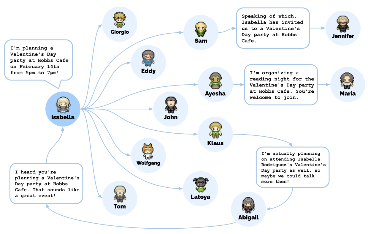 Researchers at Stanford introduced 25 ChatGPT-based AIs into a simulation to study emergent behaviors.