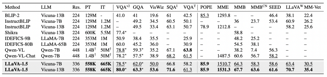 LLaVa-1.5 manages to beat all other models, models that use the same base LLM, by using orders of magnitude less data and computational effort, in some cases requiring x2,500 times less data for pre-training ('PT’ column), and 75 times less (‘IT’ column) in the fine-tuning stage.