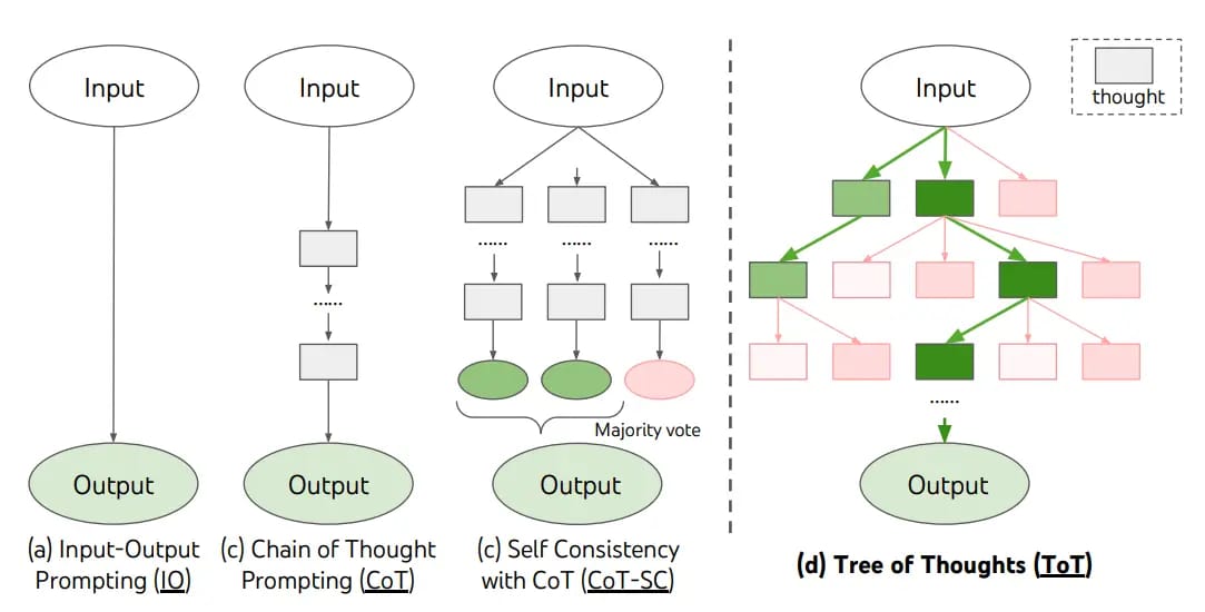 At that time, most models behaved like an option second-to-the-left, just a straight line of thoughts. Instead, I predicted models would evolve into the thing on the right, where they would explicitly reevaluate their thoughts and decide which reasoning chains to pursue and which to “kill”, creating a “tree of thoughts”.