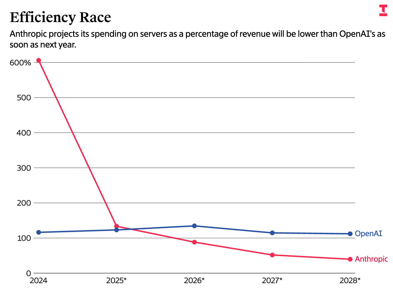 More visually, this just means Anthropic is expected to be much more efficient than OpenAI over the long run, measured by the percentage of revenue server spending represents: