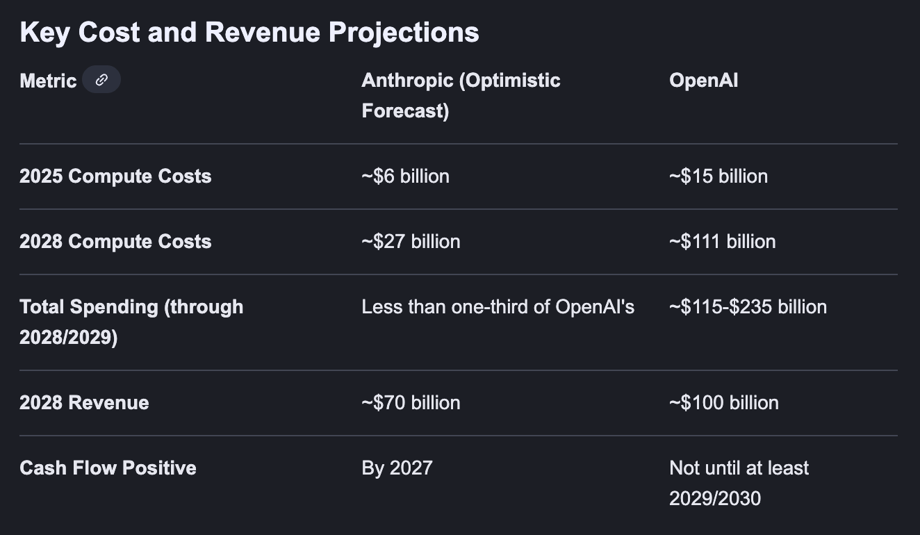 All this is to say that Anthropic is likely to be way more profitable (or, to be more specific, less unprofitable) than OpenAI. In fact, their respective internal cost projections reveal this huge disparity: