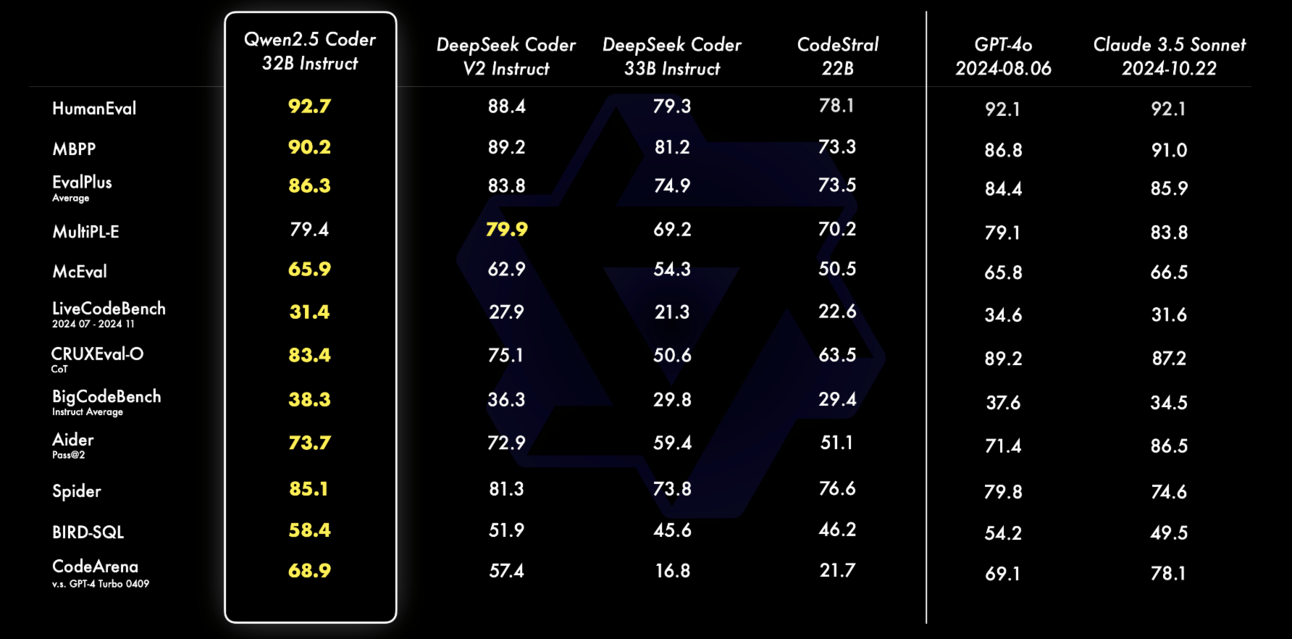 The model matches the performance of most state-of-the-art models like GPT-4o and Claude 3.5 Sonnet, beating them in most coding benchmarks (although to be fair, the benchmark that really matters, the Aider Benchmark, shows Claude 3.5 Sonnet being considerably better).