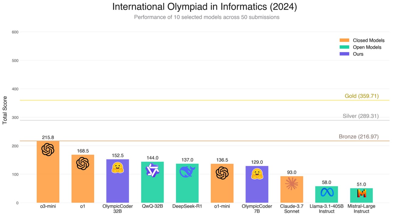 A HuggingFace team has released OlympicCoder 7B and 32B, which showcase borderline state-of-the-art (only behind ChatGPT) results when tested on last year’s International Olympiad in Informatics exam.