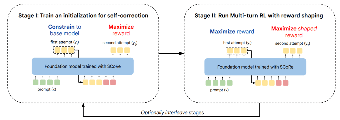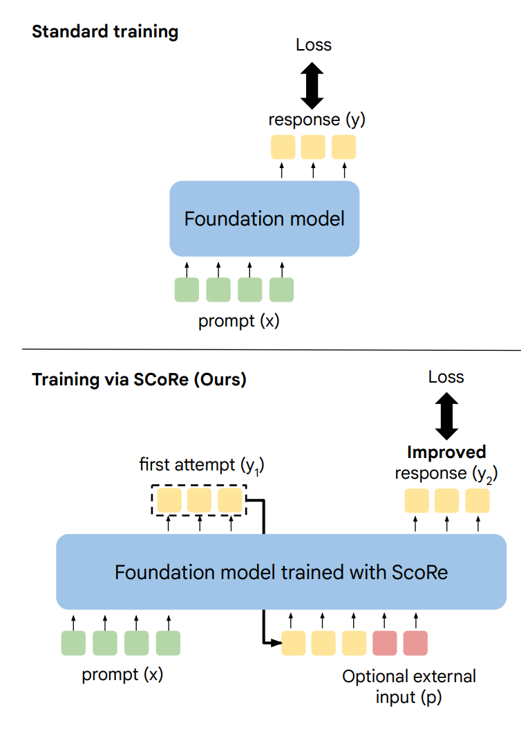 Well, we are going to vary the approach. Instead of just computing the loss for every try (how good a prediction was), leading to the model simply maximizing accuracy per try, SCoRE is a method where the model learns to do two things: