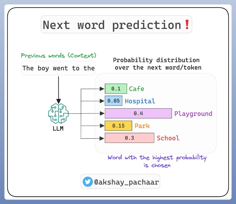 To understand how an AI works, you must always ask yourself: What is the model learning? In the case of LLMs, we are maximizing the likelihood that, upon predicting the next word in a sequence, the word assigned with the highest probability is the actual one it saw during training.