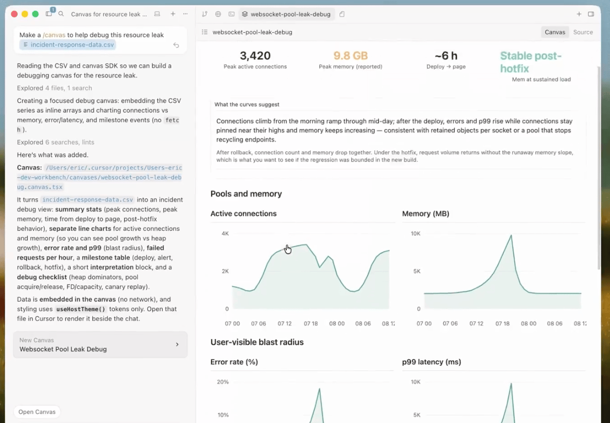 Cursor has released Canvases in Cursor 3.1. The idea is that instead of only replying in chat or markdown, the agent can now generate interactive visual interfaces such as dashboards, charts, diagrams, tables, and review UIs that live as persistent artifacts inside Cursor’s Agents window.
