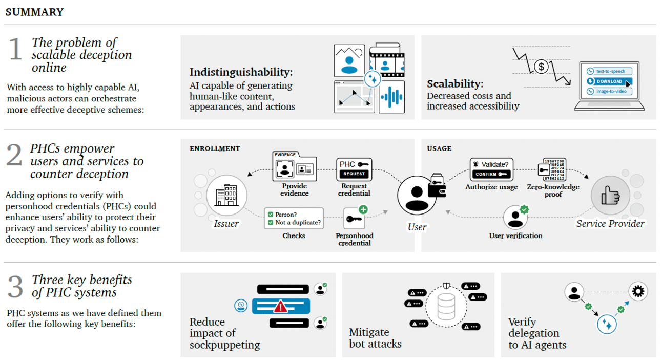 Therefore, by having a blockchain network acting as the issuer of the personhood credential, we guarantee three things: