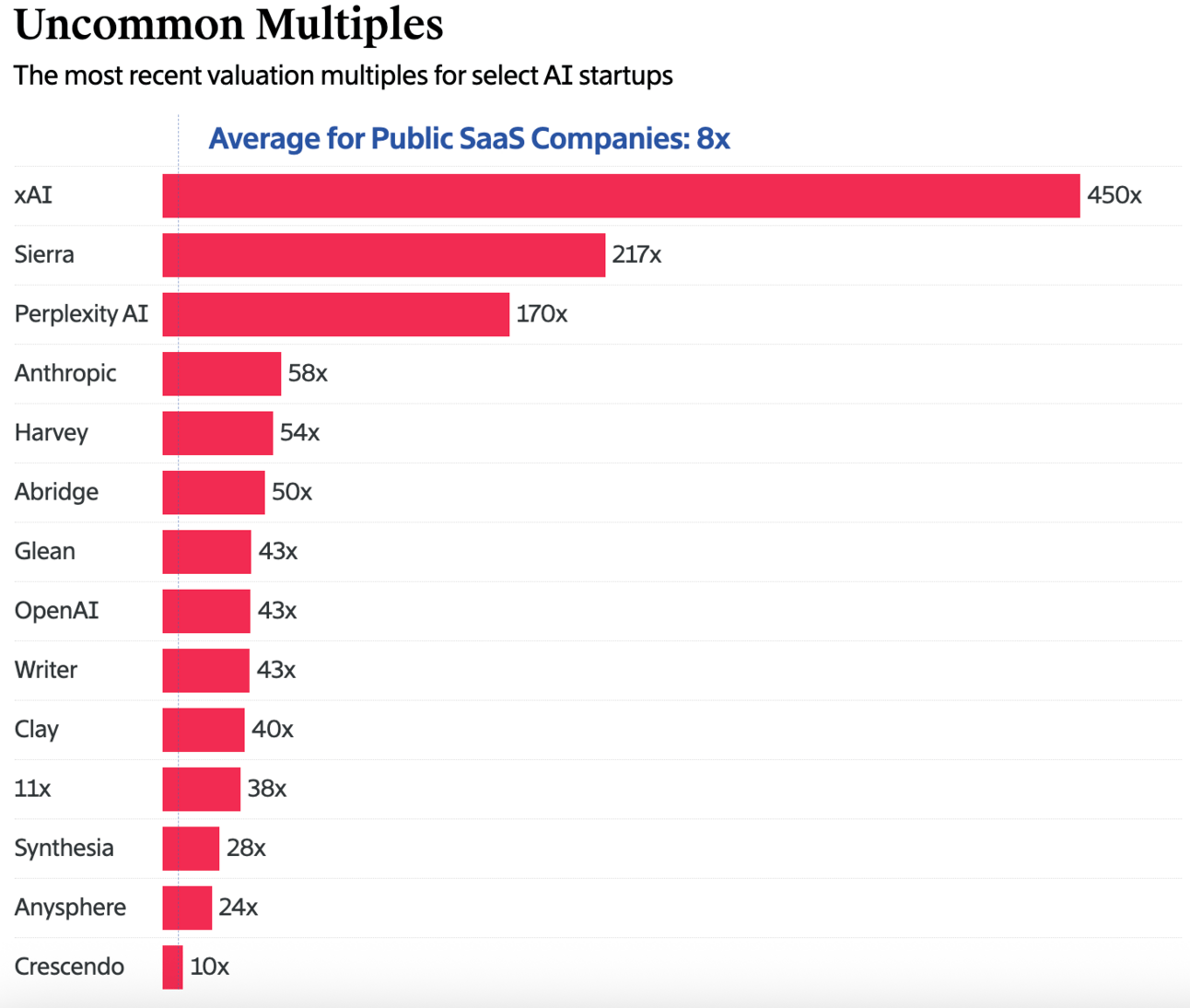Although the numbers aren’t public, it’s estimated that companies like HuggingFace, Cohere, or Sierra have multiples well above 150x or even 200 (the latter is estimated to have a 217x multiple).