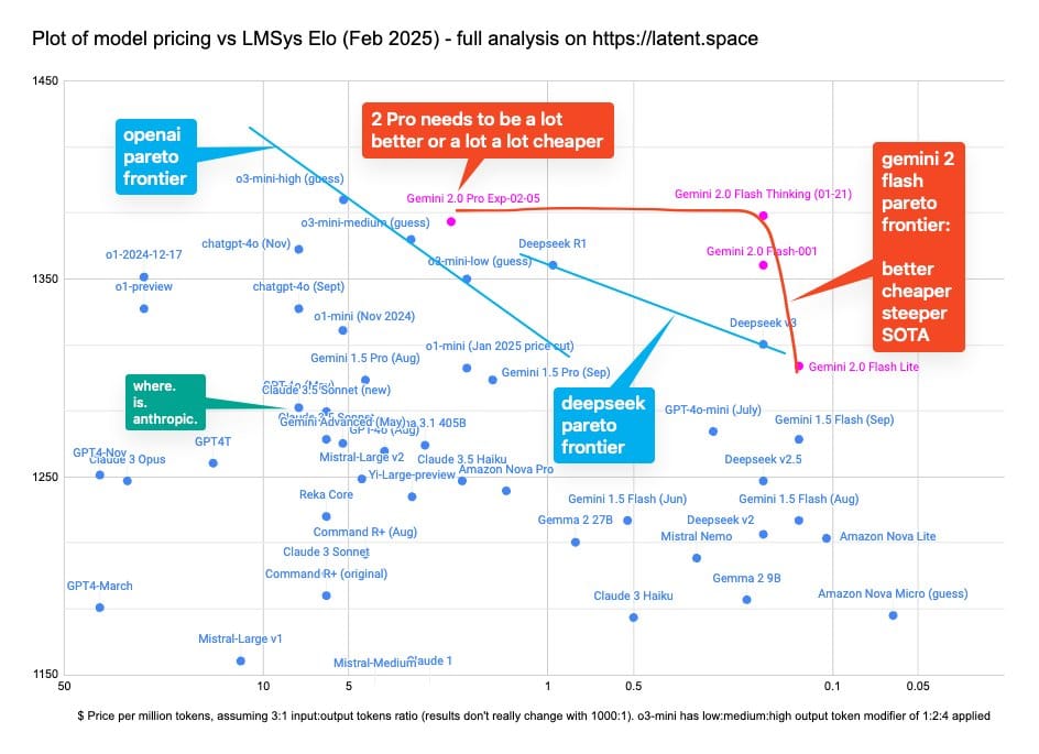 I’m shocked to see how little fuss Google’s releases make despite their models actively crushing it on benchmarks. Crucially, Google’s offering is extremely ‘Pareto optimized’ to the point that most frontier AI models in the Pareto curve (providing the best performance as a fraction of price) are Google’s, even ahead of the soul-crushing release of DeepSeek’s models (check above image).