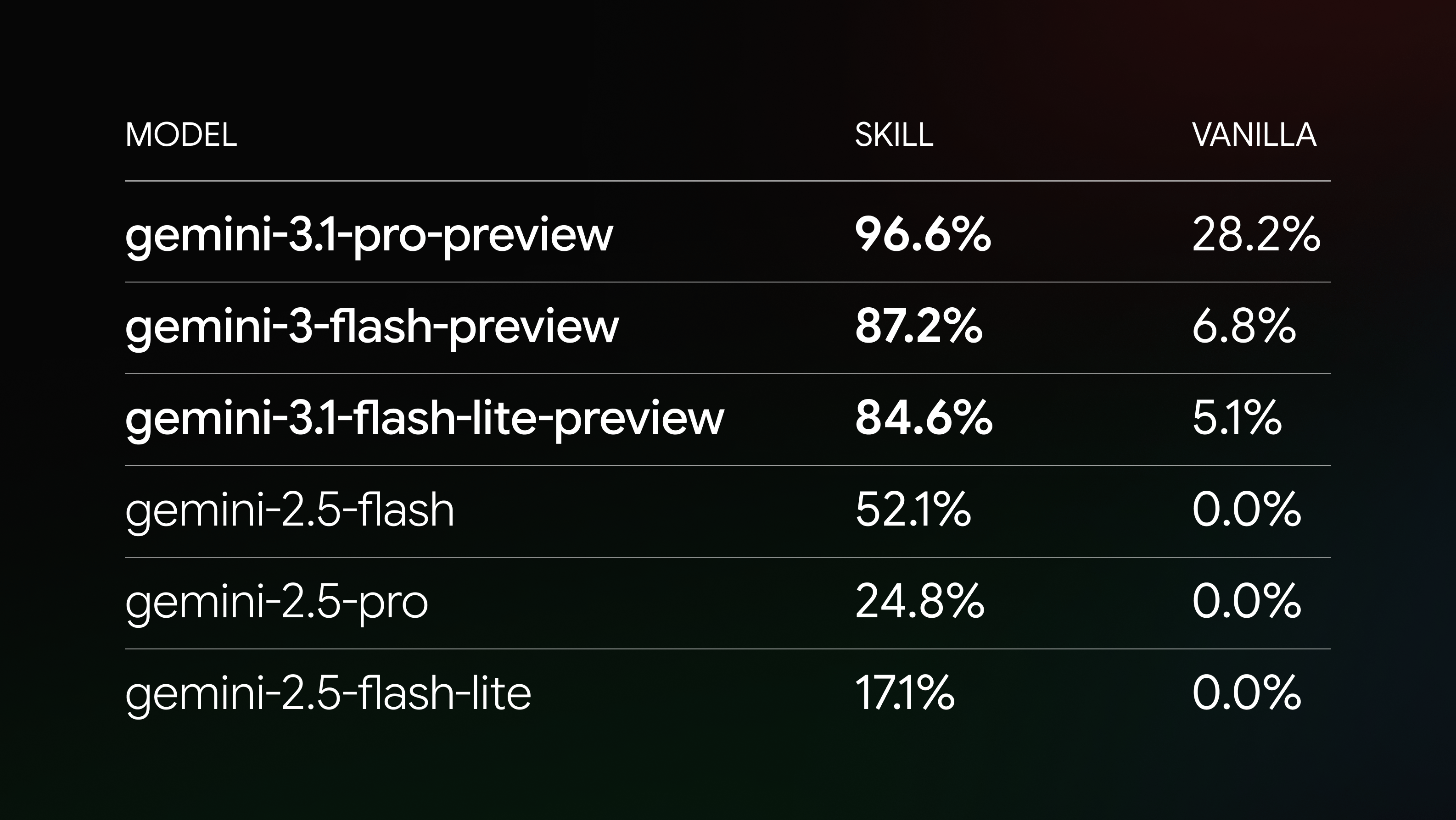 In an interesting blog post, Google DeepMind engineers show that adding a simple skill that explains how to build apps with Gemini libraries dramatically improves the model’s capacity, from less than 30% of their top model to near saturation, in some cases going from literally 0% to 52%, and from an 'okay-ish' 28% to basically perfection with the most powerful Gemini model: