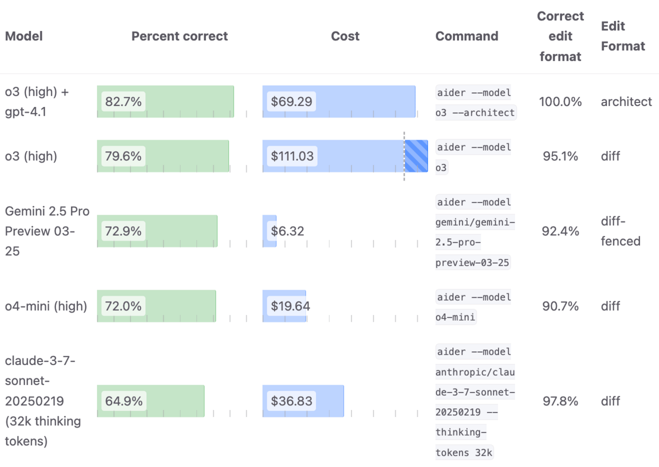 As shown below, the Aider polyglot benchmark (tier 1 coding benchmark) has o3 and o3+GPT-4.1 (o3 as orchestrator and 4.1 as code editor) with the best results. However, the associated costs are 6 and 18 times more expensive than Google’s result, achieving only 10% and 6% improvement, respectively, despite being much more expensive.