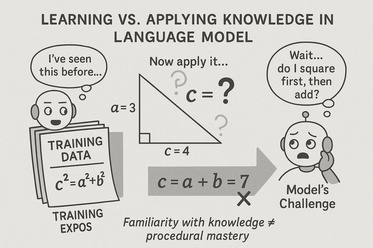 For example, suppose the model is tasked with finding the hypotenuse of a triangle with known cathetus values. In that case, it has undoubtedly seen the Pythagorean theorem hundreds of times during training but might not yet have learned how to apply the equation correctly.