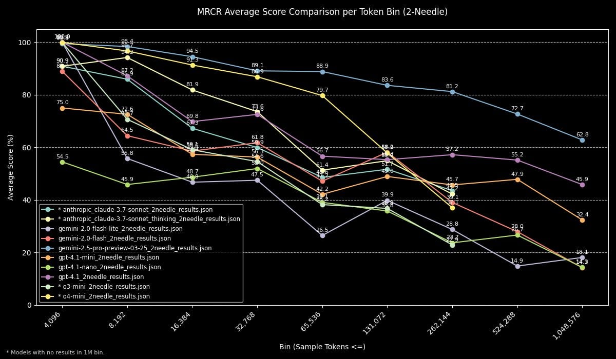 And let me be clear that o3 and o4-mini don’t lead everywhere, and Gemini 2.5 Pro takes the first spot in some cases even without considering cost, like in this long-context evaluation: