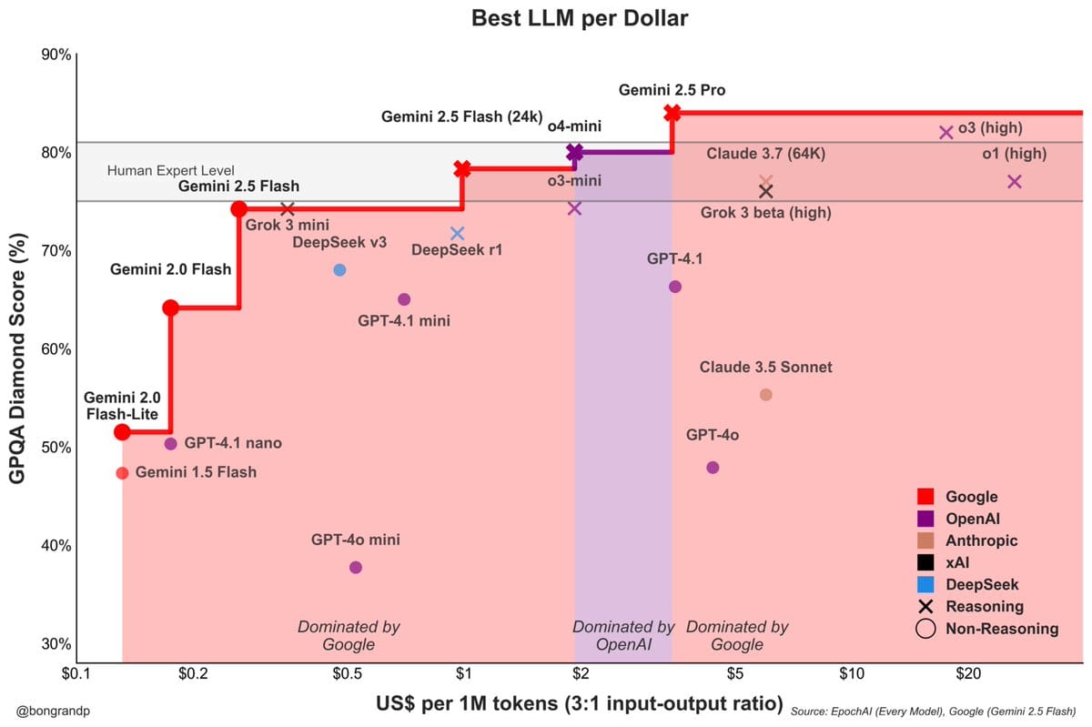 Google basically dominates the curve, with only a small part of it dominated by non-Google models (o4-mini). This is just one benchmark, but the trend is pretty much replicated in every benchmark. In some extreme cases, Google models can be several times better per dollar spent than their immediate rival, again OpenAI’s o3 and o4-mini models.