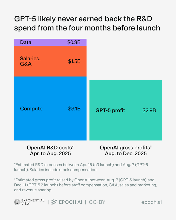 Importantly, the graph above only shows estimates for the “overall cost of GPT-5”, showing how OpenAI never actually made money from training such a model. We also kind of expected OpenAI to have such huge quarterly losses, as Microsoft basically told us when it recognized the loss in its own balance sheet (as the owner of 27.5% of OpenAI’s stock).