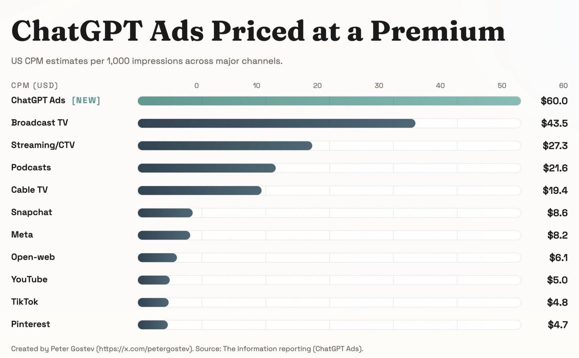 Furthermore, The Information reports that ChatGPT’s ads will be charged at a very impressive premium of $60 per 1,000 impressions, 15 times more than companies like TikTok or YouTube charge. If true, OpenAI believes either one of two things (or both):