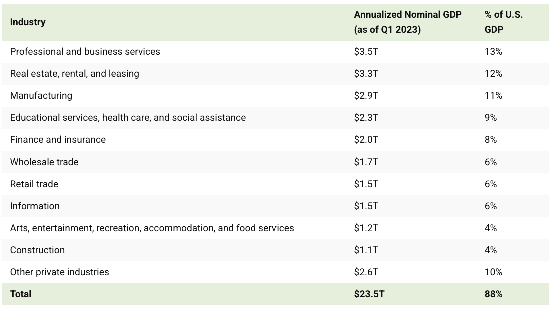 Consequently, this leads to GDP being concentrated in low-productivity sectors, like professional services, housing, or education, with very low automation potential: