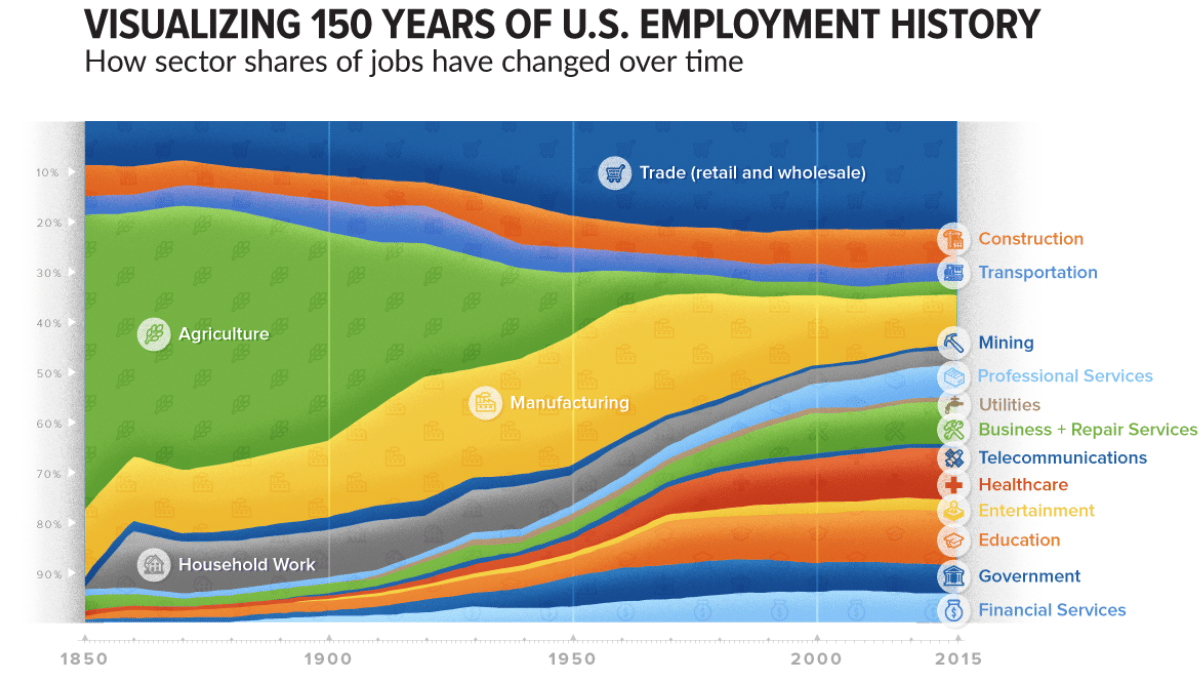 Back in 1820, agriculture was the dominant occupation in the United States (and in most countries), with an aggregate presence of 72% over total gainful work.