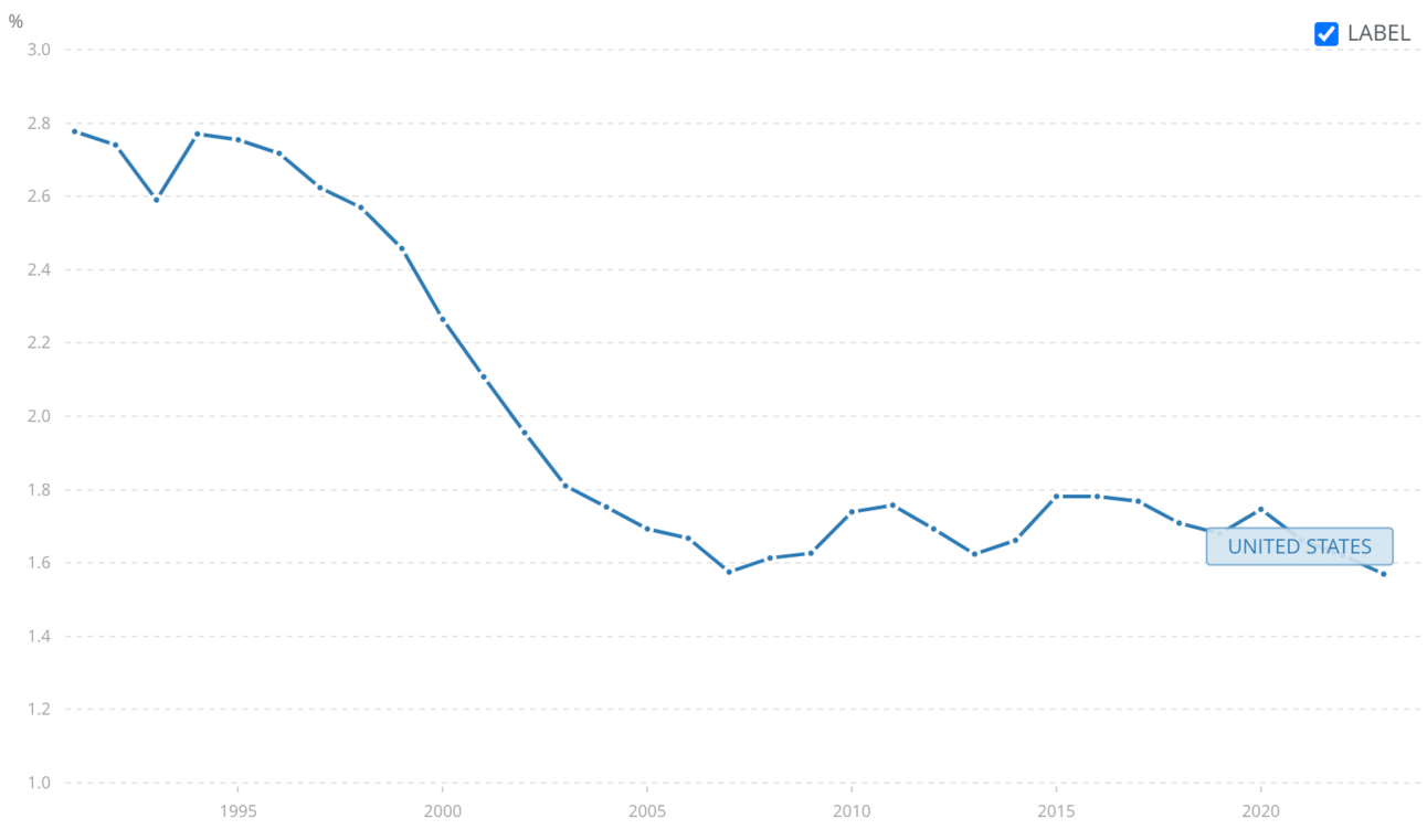Today, that value has dropped below 2% in the US, with most developed countries below the 5% mark (the global average is still high, at 26%)